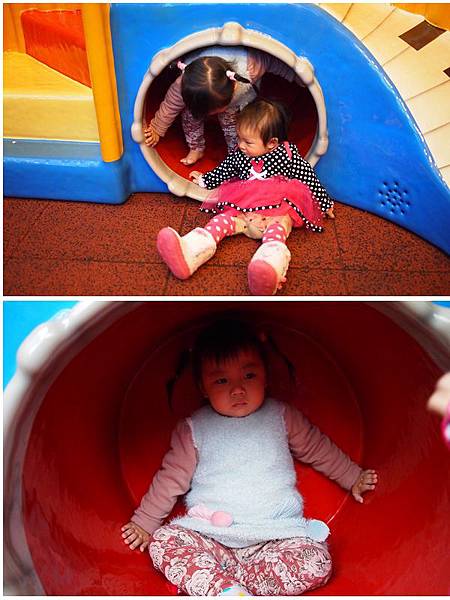 小安安一直躲到遊樂器材後面,而波妞躲到洞裡去了~